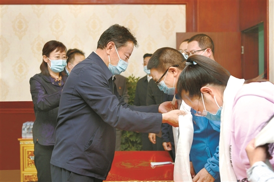 9月10日上午,區(qū)黨委常委、拉薩市委書記白瑪旺堆看望慰問離退休和辛勤工作在教育一線的教師代表,并通過他們向全市廣大教師和教育工作者致以節(jié)日的祝賀和誠摯的問候。圖為在拉薩市北京中學,白瑪旺堆為教師代表一一獻上哈達。 拉薩融媒記者 平措旺堆攝