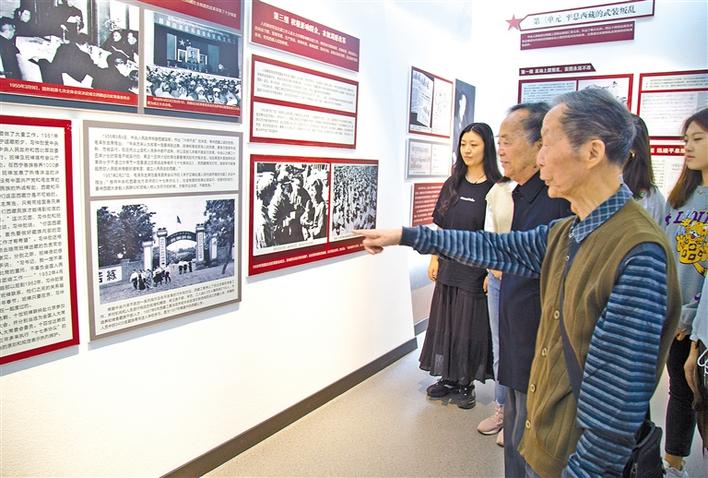 圖為展覽館內(nèi),吳逢箴教授(右一)和顧祖成教授(右二)向?qū)W生們介紹西藏民族大學校史。同東放 攝