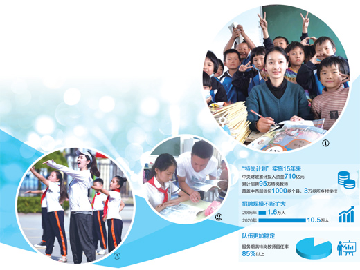 15年來,“特崗計劃”共為中西部地區(qū)22個省份1000多個縣的3萬多所鄉(xiāng)村學(xué)校和教學(xué)點補充95萬名中小學(xué)教師。通過“特崗計劃”直接或間接補充的教師,是新中國成立以來數(shù)量最多、學(xué)歷最高、待遇保障最為齊全的新一代鄉(xiāng)村教師。