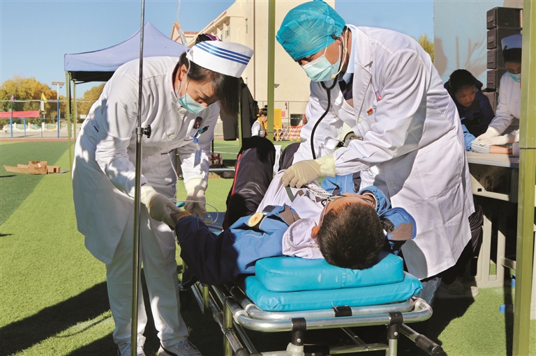 圖為在演練現(xiàn)場,醫(yī)生正在對“中毒”學(xué)生進行診療、救治。 拉薩融媒記者 龍俊霖攝