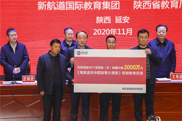 2020年是脫貧攻堅(jiān)的決戰(zhàn)決勝之年。繼陜西省56個貧困縣(區(qū))全部實(shí)現(xiàn)“脫貧摘帽”之后,又收到一份教育大禮——由新航道國際教育集團(tuán)捐贈的價值2000萬元的《用英語講中國故事》視頻課程。當(dāng)天,陜西省教育廳副廳長王海波與新航道國際教育集團(tuán)董事長兼CEO胡敏共同出席在宜川中學(xué)舉行的捐贈儀式,開啟新航道國際教育集團(tuán)助力陜西教育扶貧的新篇章。
