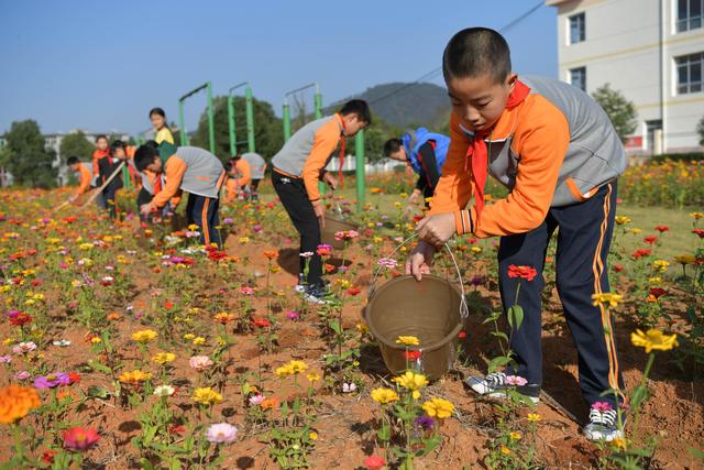 今年暑假剛剛到任江西省宜春市袁州區(qū)寨下鎮(zhèn)中心小學(xué)的殷大福校長看著教學(xué)樓前一大片長滿雜草的荒地,希望能在上面做點(diǎn)文章,讓孩子們課后有個(gè)休閑活動(dòng)的好去處。于是,他和老師們一起平整荒地,種下百日草的種子,開辟出花田和草坪。如今,昔日的荒地上已綻放出一片絢爛的花海,學(xué)生們的學(xué)習(xí)生活因此更加豐富多彩。美術(shù)課、十字繡興趣小組的同學(xué)紛紛到花田邊寫生、采風(fēng),孩子們在綠地里玩耍訓(xùn)練。每周,殷大福校長還會(huì)組織不同班級的學(xué)生下田勞動(dòng),為鮮花松土、施肥、澆水,讓他們親身體驗(yàn)守護(hù)生活中美好的滋味。呵護(hù)、陪伴、欣賞……一顆顆真善美的種子在學(xué)生們的心底悄然種下。