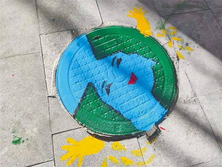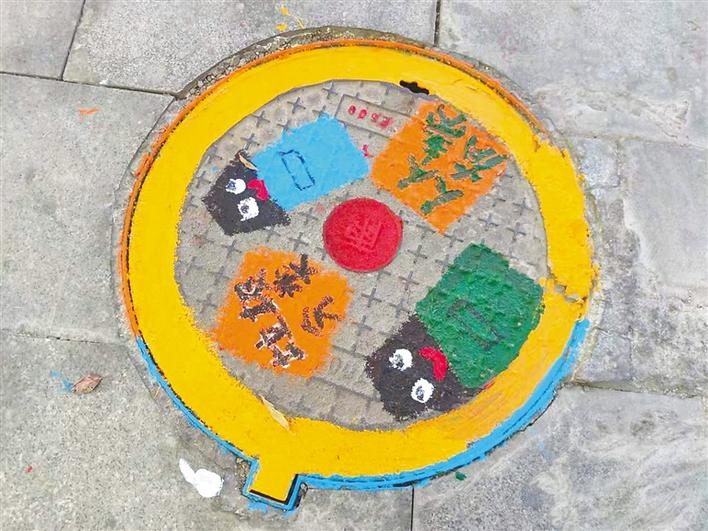 以環(huán)保、垃圾分類為主題的各種彩繪圖案覆蓋上了井蓋,使得原本黑乎乎的井蓋一下變得活潑生動(dòng)起來(lái)。