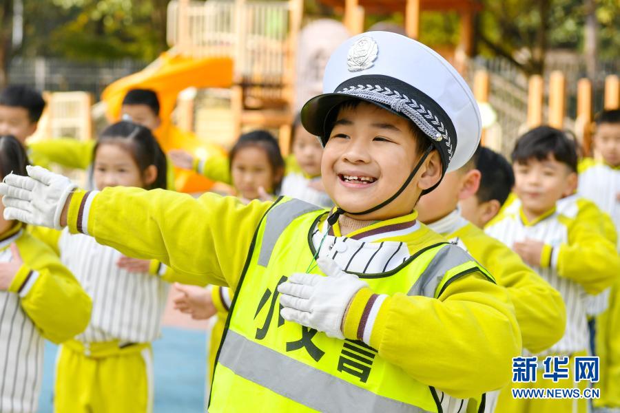 11月30日,浙江省湖州市長興縣龍山幼兒園的孩子們在學(xué)習(xí)交通指揮手勢。新華社發(fā)(譚云俸 攝)