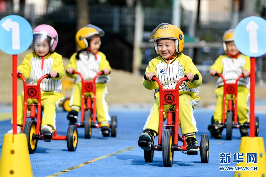 11月30日,浙江省湖州市長興縣龍山幼兒園的孩子們在做“安全騎行”游戲。新華社發(fā)(譚云俸 攝)