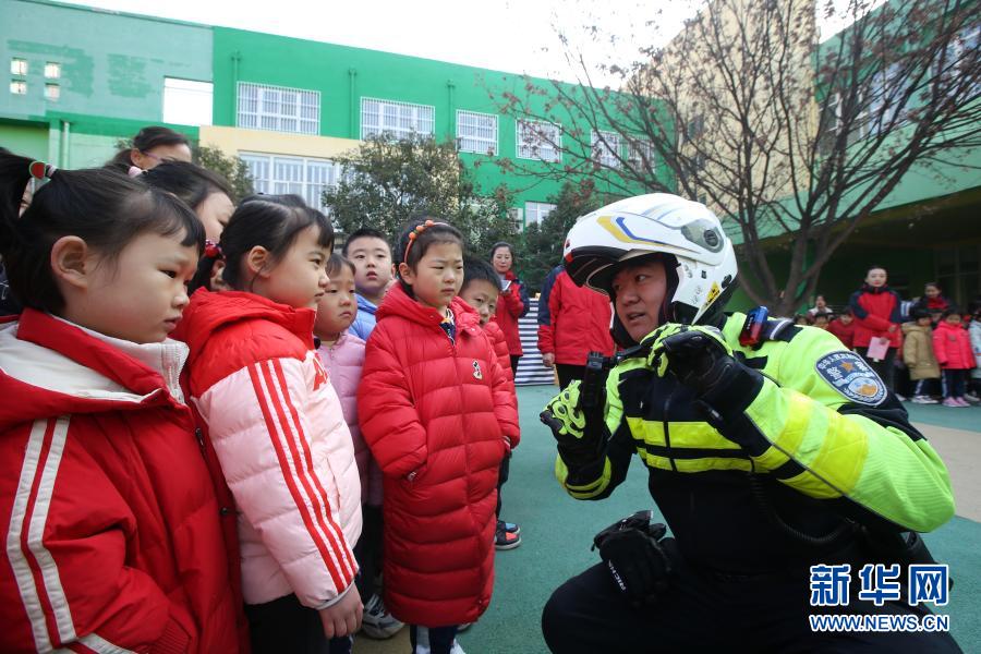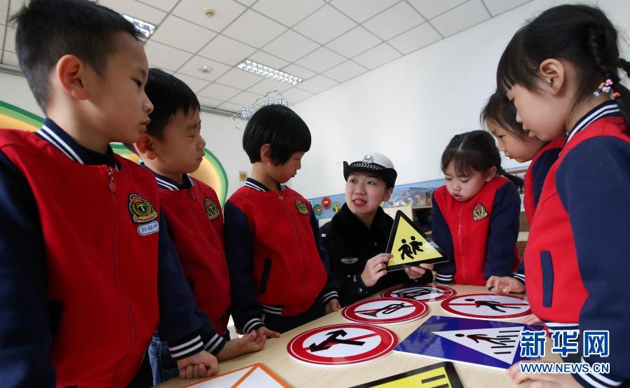 11月30日,交警在位于濟(jì)南市的山東省實(shí)驗(yàn)幼兒園南校區(qū)指導(dǎo)孩子們識別交通安全標(biāo)識牌。新華社發(fā)(郝群英 攝)