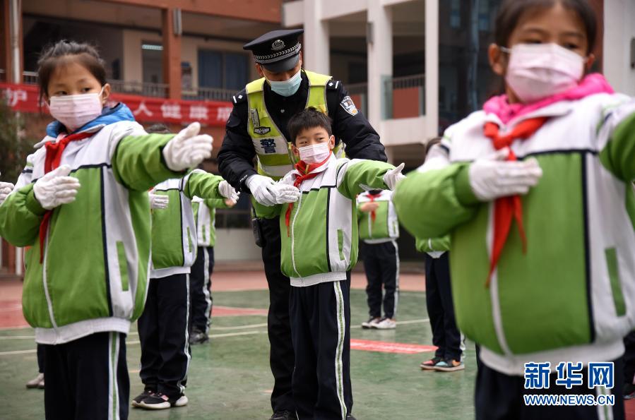 11月30日,河北省邯鄲市公安局交巡警支隊(duì)叢臺一大隊(duì)的民警在指導(dǎo)叢臺小學(xué)的學(xué)生們學(xué)習(xí)交通指揮手勢。新華社發(fā)(郝群英 攝)