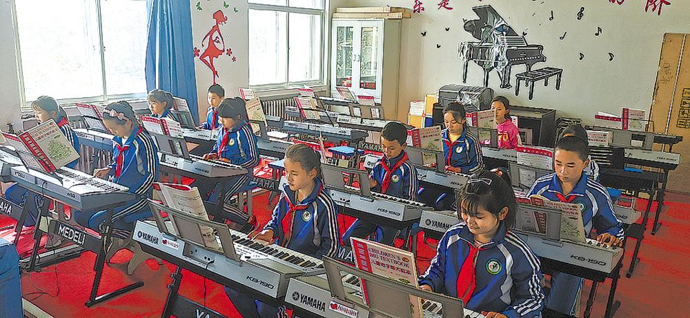 尖扎縣中學(xué)孩子們在學(xué)校少年宮學(xué)習(xí)電子琴。
