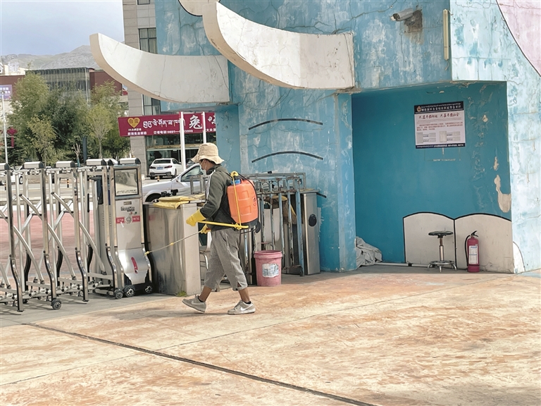 圖為在德吉羅布兒童樂園入口處,工作人員正在進(jìn)行消毒作業(yè)。 拉薩融媒見習(xí)記者 索朗曲珍攝