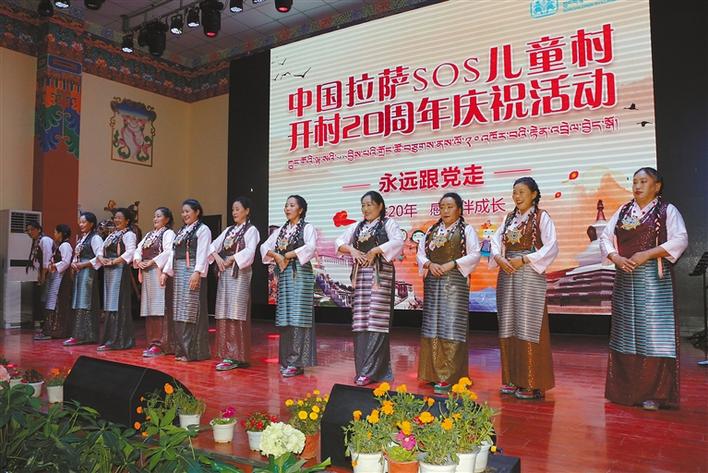 在中國拉薩SOS兒童村開村20周年慶?;顒由希琒OS村全體干部職工和孩子們共唱國歌。