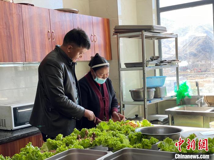 圖為達(dá)旦(左)正在查看“愛心午餐”的備餐情況?!≈x牧 攝