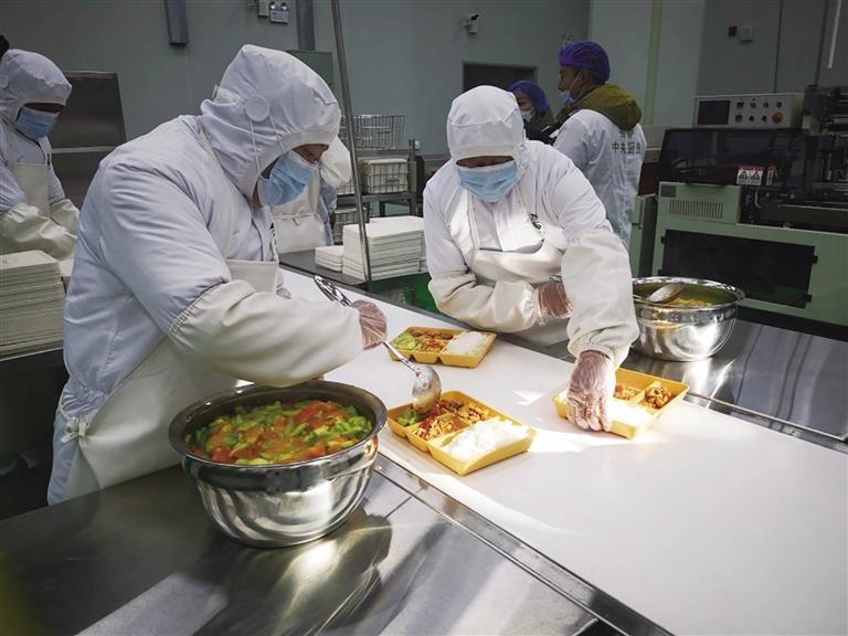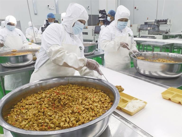 這些凈菜準備好后,通過設備轉運至熱菜烹炒車間,在這里有幾位廚師正在烹飪宮保雞丁、西紅柿炒蛋、青菜西紅柿湯等。這些凈菜經(jīng)過加工之后被運送至分餐車間。餐盒經(jīng)高溫消毒后,工作人員將每一份米飯、熱菜取樣留存,然后開始分工分餐,打包好的餐盒通過加溫消毒后,裝進保溫箱,運送至配餐車內(nèi)。