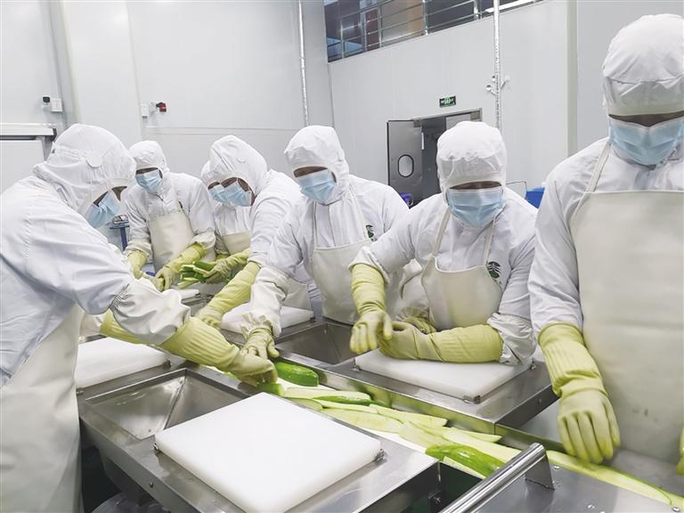 通過員工通道,在該廚房生產(chǎn)廠長甘文忠的指導下,記者穿上了白色工作服、戴上食品安全帽,換上高筒膠鞋,洗手消毒、測量體溫、隨身攜帶的手機、首飾全部摘掉后,通過腳踏池進入生產(chǎn)加工車間。