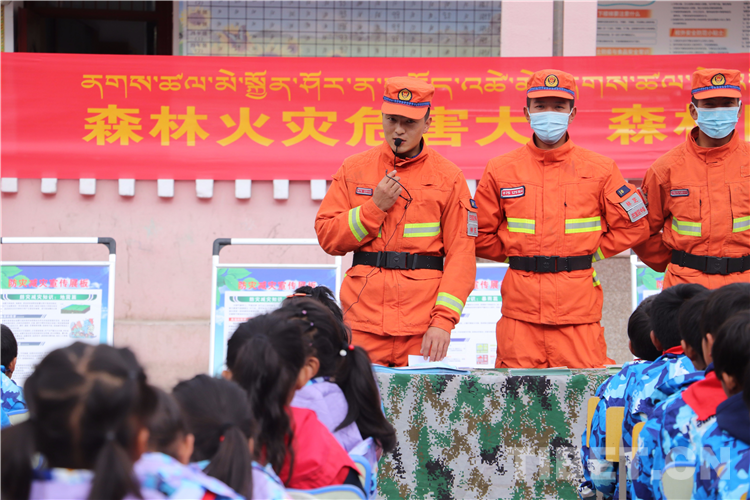在墨脫縣格當鄉(xiāng)小學,墨脫縣駐防分隊指戰(zhàn)員以圖片展示、案例講解、發(fā)放傳單等形式,向師生們詳細闡述森林火災的起因、撲救難度系數(shù)以及給幸福家園帶來的重大危害,引導師生們樹立保護森林資源就是保護幸福家園的觀念。