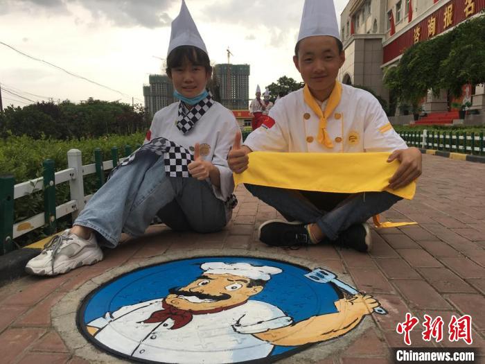 圖為蘭州一家烹飪職業(yè)院校學生給校園井蓋“換裝”。(資料圖) 張婧 攝