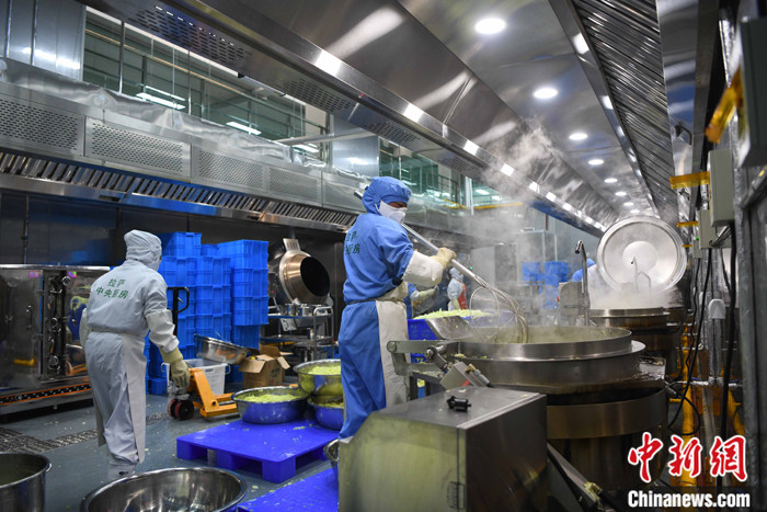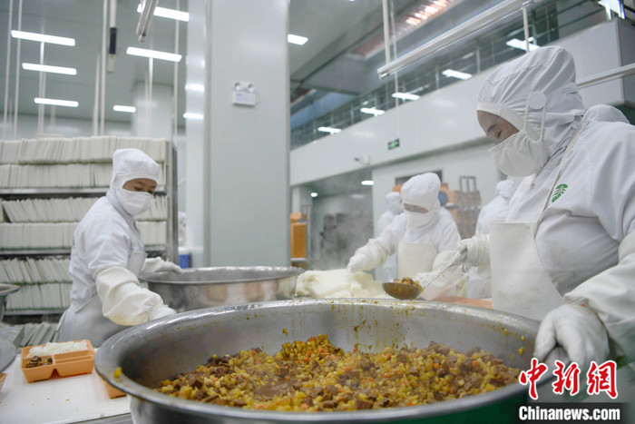 圖為3月11日,西藏自治區(qū)拉薩市城關區(qū)凈土拉薩中央廚房配餐車間內,工作人員正在為學生集中配餐。 中新社記者 貢嘎來松 攝