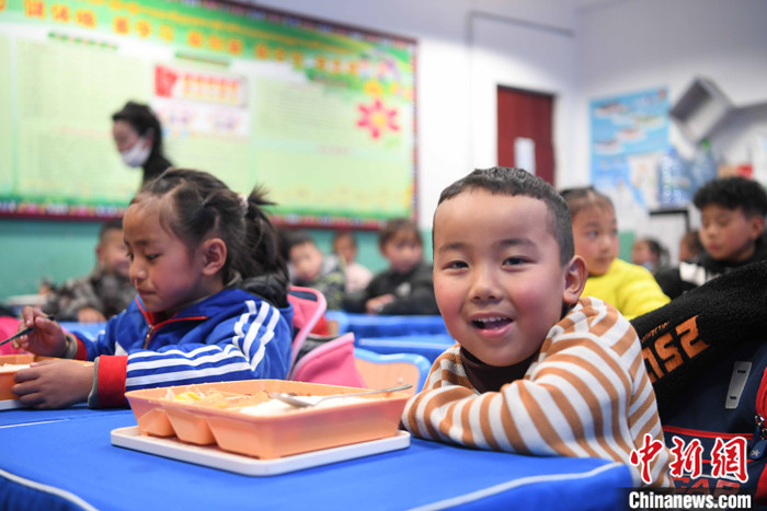 圖為3月11日,西藏自治區(qū)拉薩市城關區(qū)第三小學的學生食用營養(yǎng)午餐。 中新社記者 貢嘎來松 攝