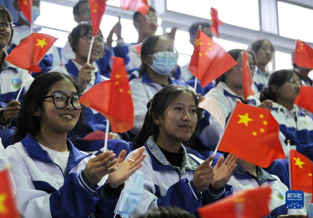 山南市第二高級中學(xué)學(xué)生在體育館觀看中華詩文朗誦會(6月3日攝)。新華社記者 劉洲鵬 攝