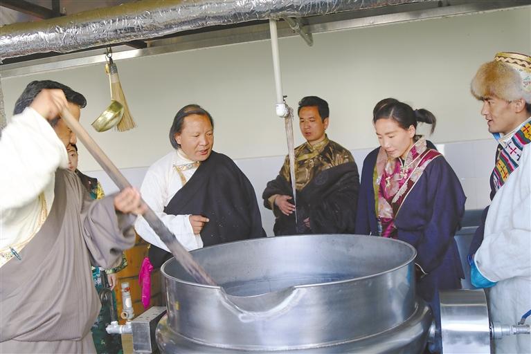 圖為國家級非物質(zhì)文化遺產(chǎn)代表性項目——藏醫(yī)藥浴法傳承人明珠(左二)指導(dǎo)學(xué)生(制藥師)煎熬“五味甘露”。山南市藏醫(yī)醫(yī)院供圖