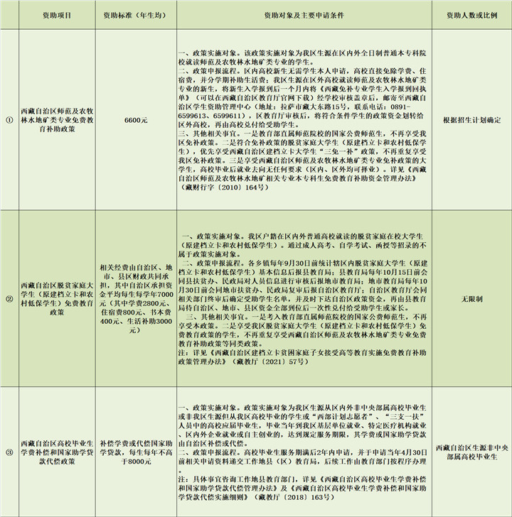 以下為西藏自治區(qū)本??平逃A段學(xué)生資助政策簡(jiǎn)介和服務(wù)熱線詳細(xì)情況: