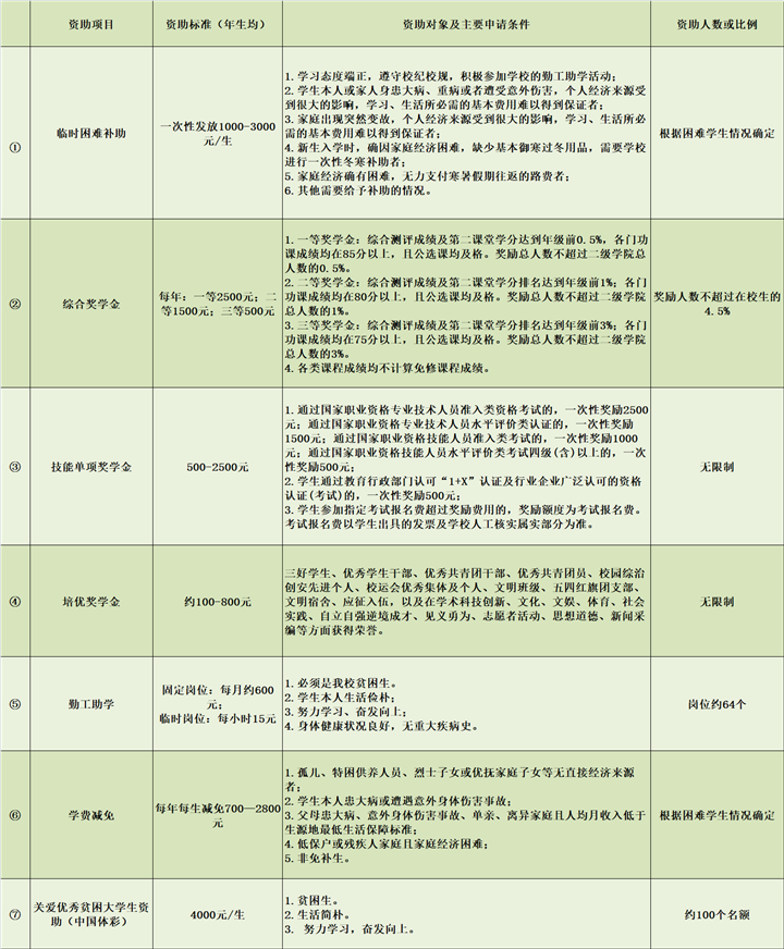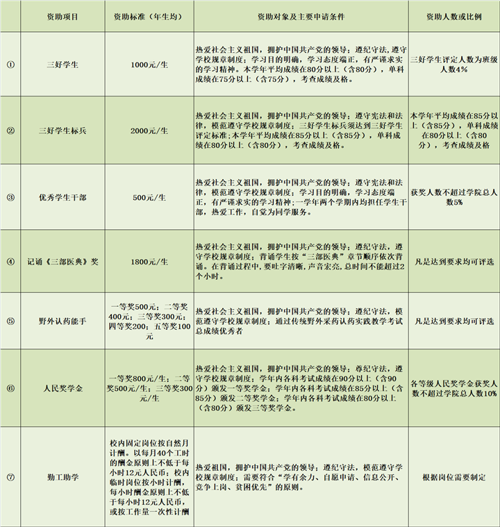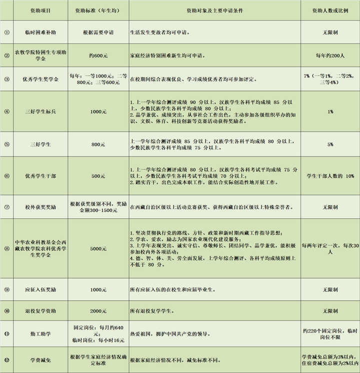這些資助項(xiàng)目包括國(guó)家政策、西藏自治區(qū)政策和西藏各高校的政策,全部列出了明確的申請(qǐng)條件,涵蓋了學(xué)生生活、學(xué)習(xí)的方方面面。其中,有的項(xiàng)目針對(duì)家庭經(jīng)濟(jì)困難的學(xué)生給予學(xué)費(fèi)、住宿費(fèi)等的減免;有的項(xiàng)目為學(xué)生提供各種校內(nèi)勤工助學(xué)機(jī)會(huì),讓學(xué)生通過勞動(dòng)獲得報(bào)酬;有的項(xiàng)目獎(jiǎng)勵(lì)入伍,有的項(xiàng)目獎(jiǎng)勵(lì)發(fā)明創(chuàng)造……并且,西藏各高校在制定資助政策時(shí)體現(xiàn)出了各學(xué)校鮮明的辦學(xué)特點(diǎn)。例如,西藏藏醫(yī)藥大學(xué)設(shè)置了面向所有學(xué)生的“記誦《三部醫(yī)典》獎(jiǎng)”,要求“熱愛社會(huì)主義祖國(guó),擁護(hù)中國(guó)共產(chǎn)黨的領(lǐng)導(dǎo);遵紀(jì)守法,遵守學(xué)校規(guī)章制度;背誦學(xué)生按‘三部醫(yī)典’章節(jié)順序依次背誦。在背誦過程中,要吐字清晰,聲音宏亮,總時(shí)間不能超過2個(gè)小時(shí)?!狈彩沁_(dá)到要求的學(xué)生,獎(jiǎng)勵(lì)1800元。