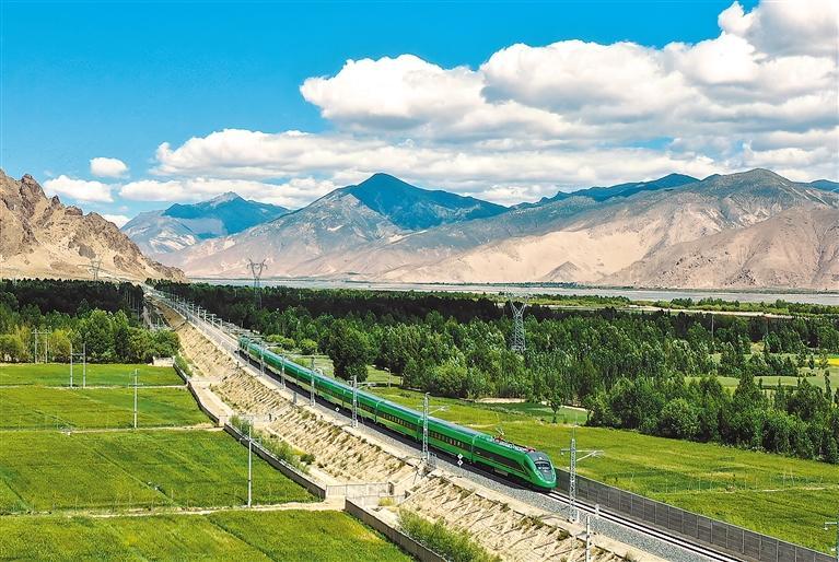 中央支持西藏自治區(qū)基本建成涵蓋公路、鐵路、航空、管道等多種運輸方式的綜合立體交通網(wǎng)絡(luò)。2021年6月25日,川藏鐵路拉林段正式開通運營。圖為開通當日,復(fù)興號高原內(nèi)電雙源動車組首次開上青藏高原。
