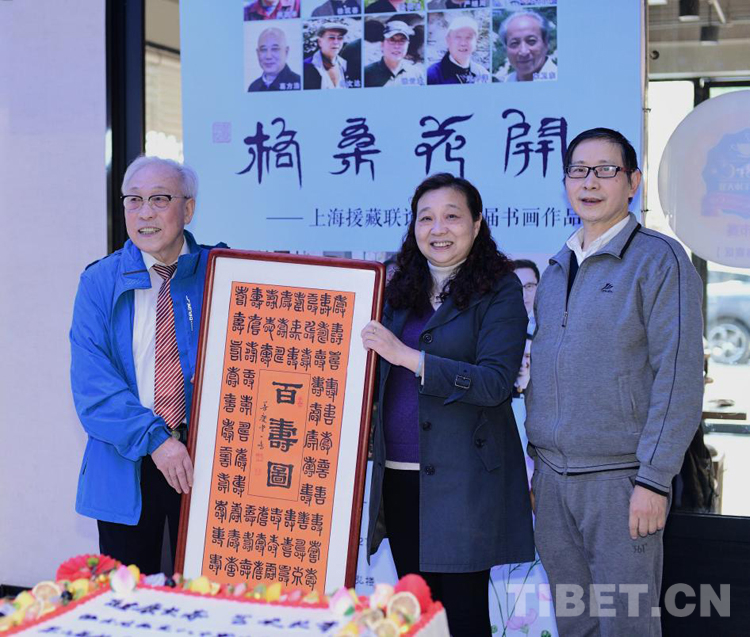 開(kāi)幕式當(dāng)天,恰逢張先生八十大壽,書(shū)畫(huà)展組委會(huì)特地送上蛋糕祝賀,徐匯區(qū)書(shū)畫(huà)協(xié)會(huì)也以一幅《百壽圖》向張先生表達(dá)敬意,祝他“健康長(zhǎng)壽、藝術(shù)長(zhǎng)青”。(中國(guó)西藏網(wǎng) 文/葛榮江)