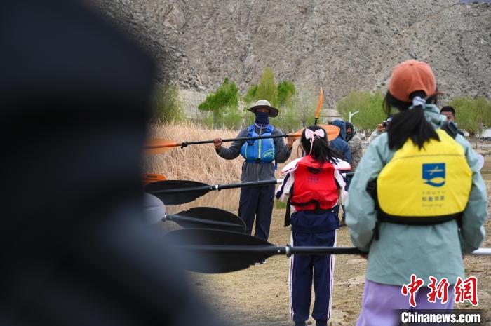 圖為皮劃艇教練向體驗者講授皮劃艇操作技術?!≮w朗 攝