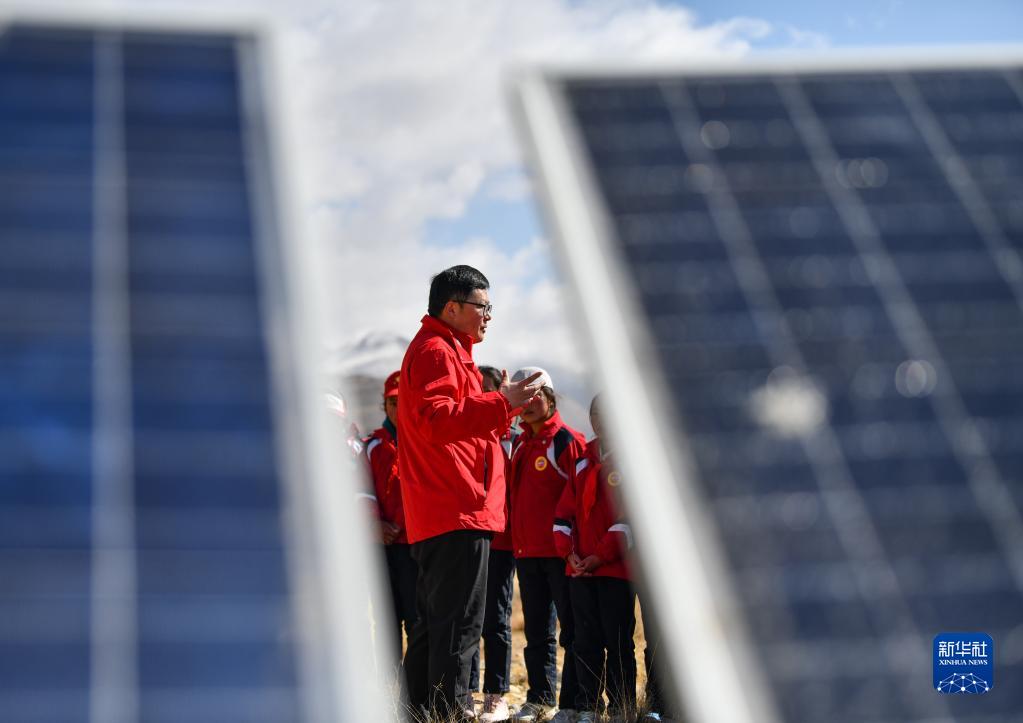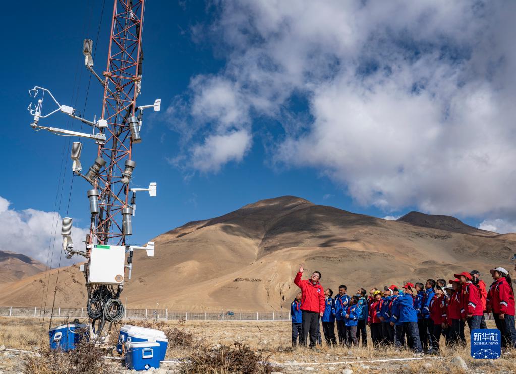 5月15日,珠峰站工作人員席振華給孩子們講解科學(xué)儀器的功能作用。新華社記者 晉美多吉 攝
