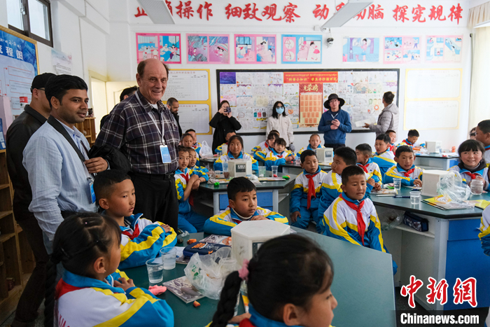 圖為5月18日上午,參訪團成員在林芝市第二小學(xué)觀看孩子們上實驗課。 中新社記者 江飛波 攝