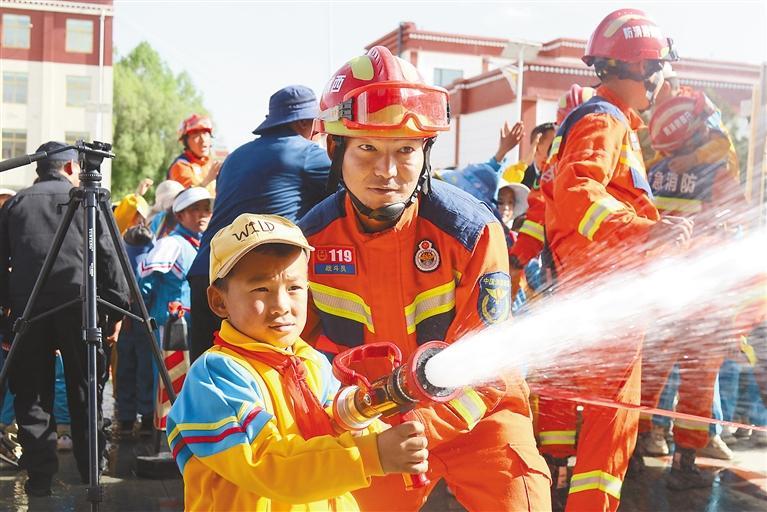 日喀則市小學(xué)學(xué)生體驗滅火救援器材。