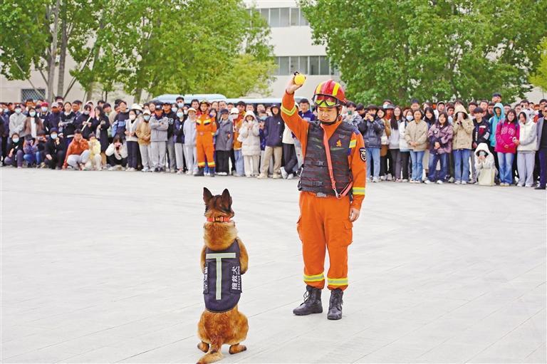 消防指戰(zhàn)員在西藏大學(xué)進行搜救犬表演。肖暄 攝