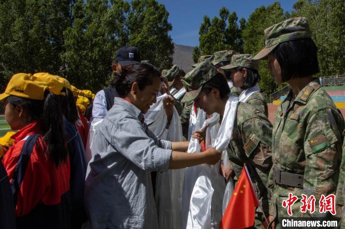 圖為該小學老師為女兵獻上哈達表示感謝。 朱政 攝