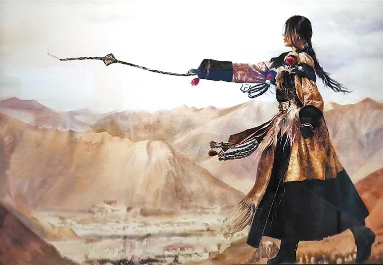 中國畫作品《幸福西藏》運用工筆重彩的繪畫藝術表現(xiàn)形式,描繪了布達拉宮廣場上民族和睦的美好生活圖景。畫面中,湛藍天空下,藏族群眾與遠道而來的各地游客們相聚雪域高原,燦爛的笑容映照出新時代西藏人民的美好生活,也反映出西藏自然風光、人文風情對各地游客的極大吸引力。從青年旅行者們或騎著單車,或舉起相機認真拍照的表情,能深刻感受到他們對美麗西藏的向往。同時,繪畫作品反映出近年來西藏旅游事業(yè)的蓬勃發(fā)展以及各族兒女團結(jié)互助、攜手進步的新時代美好生活景象。水彩·粉畫《颯·薩》運用人物特寫的藝術創(chuàng)作手法,展現(xiàn)出一位西藏姑娘甩出烏爾朵的颯爽姿態(tài);油畫《藏歷新年薩迦禳祈?!芬悦骺鞜崃业纳屎嫱谐霎?shù)孛癖娺M行藏歷新年祈?;顒拥臍g樂場景;油畫《中國玉麥》以紀實敘事的創(chuàng)作方式,描繪了隆子縣玉麥鄉(xiāng)卓嘎、央宗姐妹放牧守邊的故事,畫面中她們專注地懸掛國旗的樸實舉動,傳遞出高原姊妹對祖國的深愛之情。