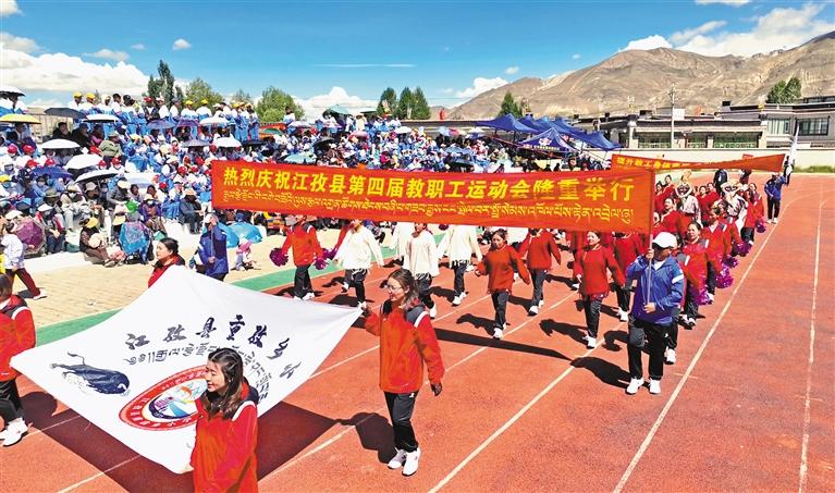 近日,日喀則市江孜縣教育系統(tǒng)舉辦以“奮斗教育路 建功英雄城”為主題的第四屆教職工運動會。本屆教職工運動會比賽項目眾多,競賽類項目有男女100米跑步賽、男女4×100米接力賽;田賽類項目有男女鉛球、男女跳遠、男女一分鐘跳繩和女子一分鐘踢毽子比賽;傳統(tǒng)賽類項目有吉韌(藏式克郎球)、藏棋(國王與大臣)、男女拔河比賽、秀茲(藏骰一男一女混合);趣味賽類項目有陸地龍舟(男女混合)、旋風跑(男女混合)、隔空取物(男女混合)、“乒”盡全力(男女混合);球賽類項目有男子足球和籃球、女子籃球比賽等項目。