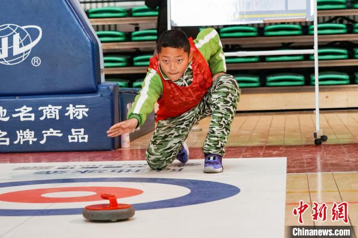 圖為在青海民族大學,一名校園組選手在陸地冰壺比賽中投壺。 馬銘言 攝