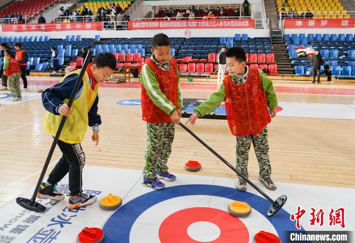 圖為在青海民族大學,校園組選手正在進行陸地冰壺項目的比賽。馬銘言 攝
