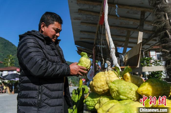 12月19日,48歲的門巴族次仁旺加在家門口馬路邊碼放大檸檬,這些墨脫特產(chǎn)主要向路過(guò)的游客銷售。中新社記者 江飛波 攝