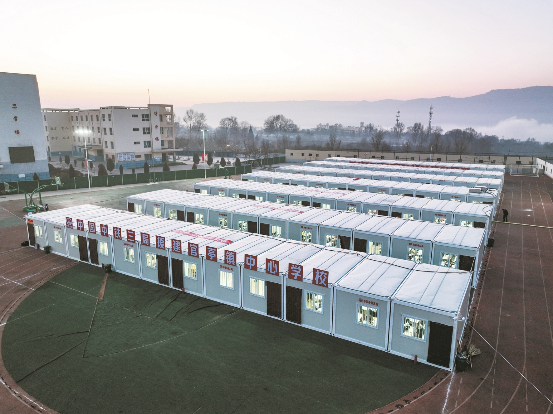 這是1月2日在青海省海東市民和回族土族自治縣官亭鎮(zhèn)中心學(xué)校拍攝的板房教室(無(wú)人機(jī)照片)。(新華社發(fā))