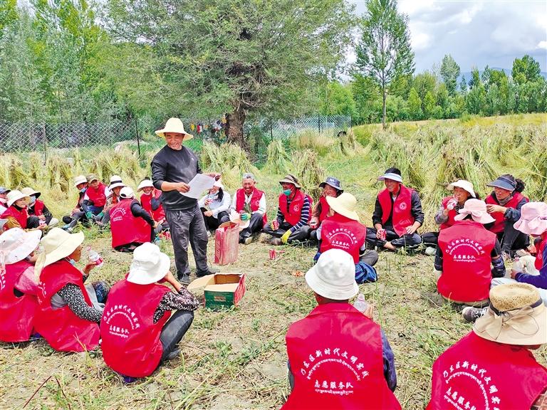 圖為乃東區(qū)新時代文明實踐志愿服務隊在田間地頭學習強農(nóng)惠農(nóng)政策。記者 劉楓 攝