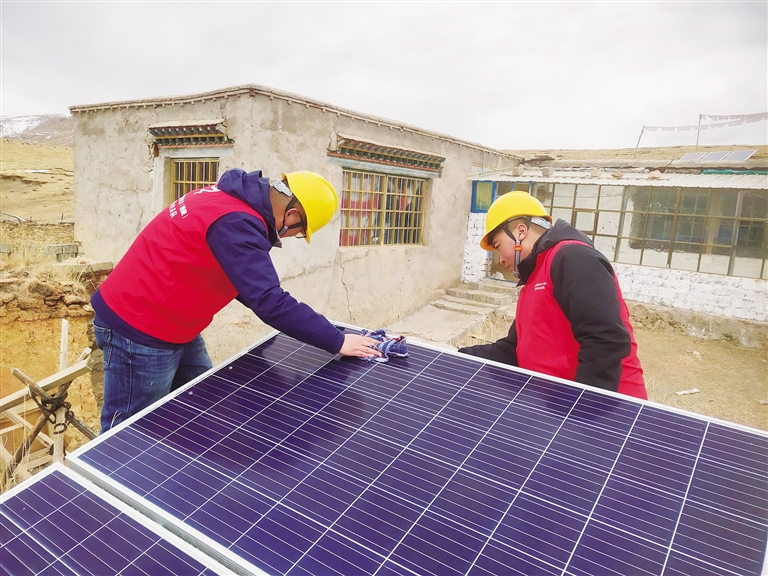 “次桑在家嗎?我們過來看一下你們新年準備得怎么樣了?”聽到劉光輝的呼喚,孩子們都跑出來迎接這位“小黃帽”叔叔。劉光輝和羅桑歐珠進屋放下年貨,顧不上休息,立馬搭梯子爬上次桑家的房頂,用抹布拂去光伏電板上的塵土,拿出工具仔細檢查電源和光伏設(shè)備是否有損壞?!按紊<矣玫氖俏覀兊牡谝淮柲芄夥姲澹@個電板要經(jīng)常擦拭,保持表面干凈,發(fā)電效率會更好?!眲⒐廨x說。檢修完光伏電板后,劉光輝和羅桑歐珠又回到屋內(nèi)檢查次桑家的電路線路,對插排插座等可能存在安全隱患的地方進行認真排查。確保沒有問題后,兩人將之前昏暗的燈泡全部換成了最新的節(jié)能燈泡,整個屋子一下亮堂了起來。