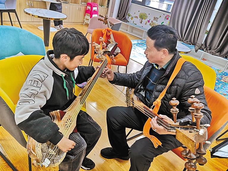 圖為興趣班老師在教學員彈扎念琴。記者 謝筱純 王珊 通訊員 德吉 攝
