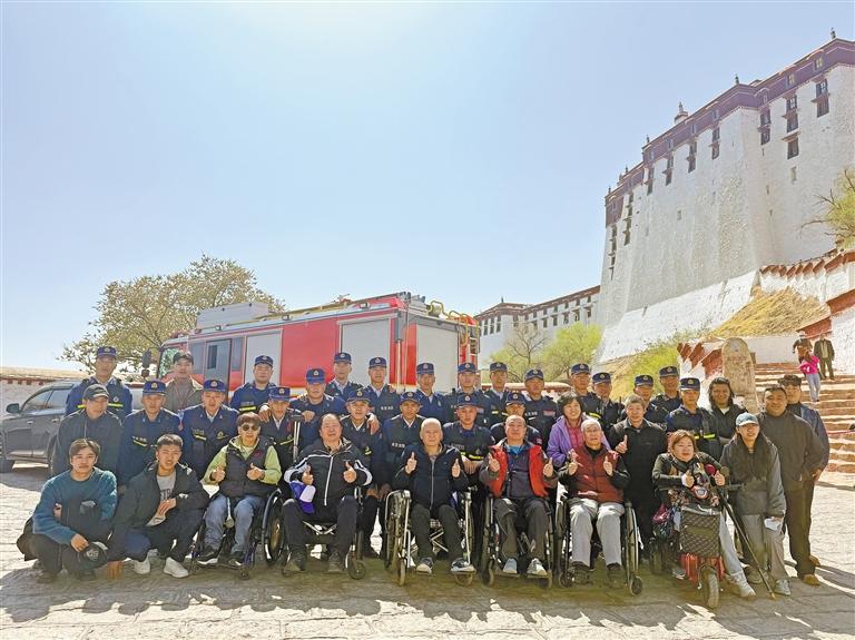 近日,西藏自治區(qū)殘疾人聯(lián)合會(huì)攜手西藏自治區(qū)殘疾人就業(yè)創(chuàng)業(yè)園共同舉辦“有愛無礙·推動(dòng)無障礙”活動(dòng),幫助25位殘障人士“圓夢”游覽布達(dá)拉宮。這些殘障人士中,有15位肢體殘疾、4位視力殘疾、6位重度輪椅使用者和2位重度全盲者。拉薩市布達(dá)拉宮消防救援大隊(duì)光榮受命,為本次活動(dòng)保駕護(hù)航。