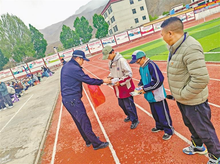 圖為民警為仁布縣中學兩名拾金不昧少年發(fā)放獎品。記者 彭琦 攝