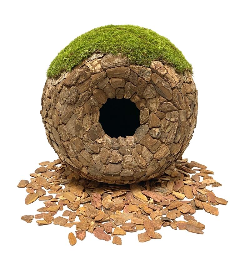 嘎瑪次仁的作品聚焦生態(tài)環(huán)境,作品《意象·自然》,是對“自然”理解的一種概念性的抽象表達(dá)。其形式上為一個中空球形裝置,表面為拼貼的樹皮,頂部種植有苔蘚。正面的部分區(qū)域內(nèi)陷,中間為一孔洞,為了更凸顯出洞中的“黑暗”與“未知”,內(nèi)部涂有特殊啞光涂料。為了體現(xiàn)出“生命感”,他在作品內(nèi)部安裝了感應(yīng)發(fā)聲裝置,感知到人靠近后會發(fā)出輕微的心跳聲。