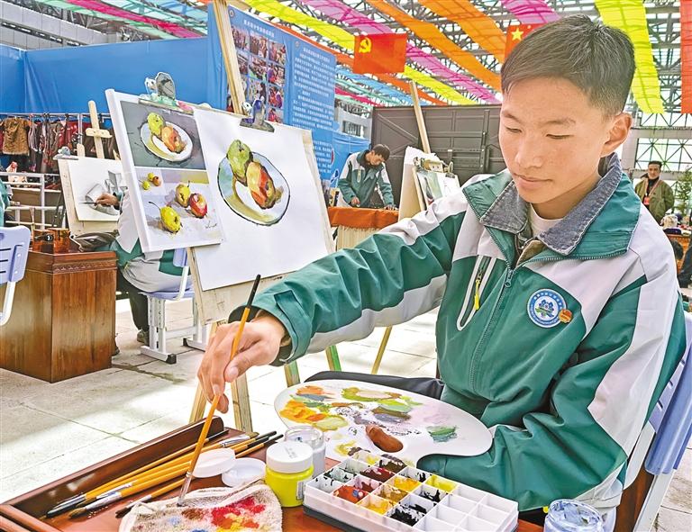圖為那曲市職業(yè)技術(shù)學校的學生在進行繪畫創(chuàng)作。記者 萬靖 攝