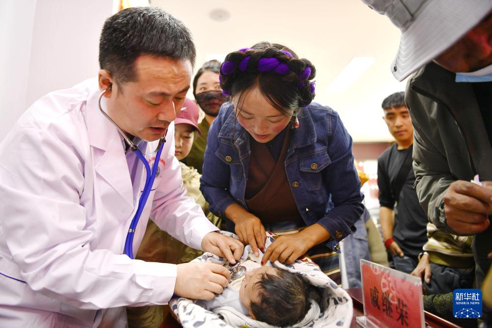 7月23日,南京醫(yī)科大學附屬兒童醫(yī)院心胸外科主任戚繼榮(左)在墨竹工卡縣為兒童體檢。 新華社記者 張汝鋒 攝