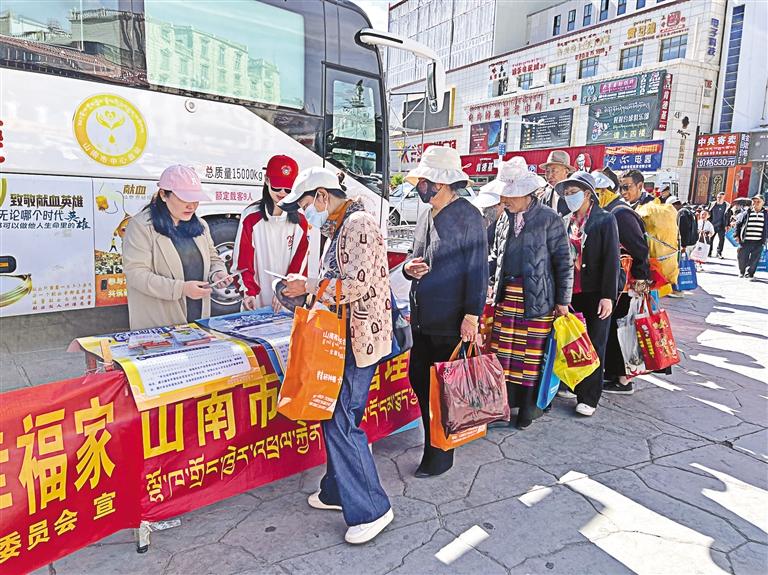 圖為宣講員向過往群眾發(fā)放宣傳冊。記者 巴桑旺姆 攝