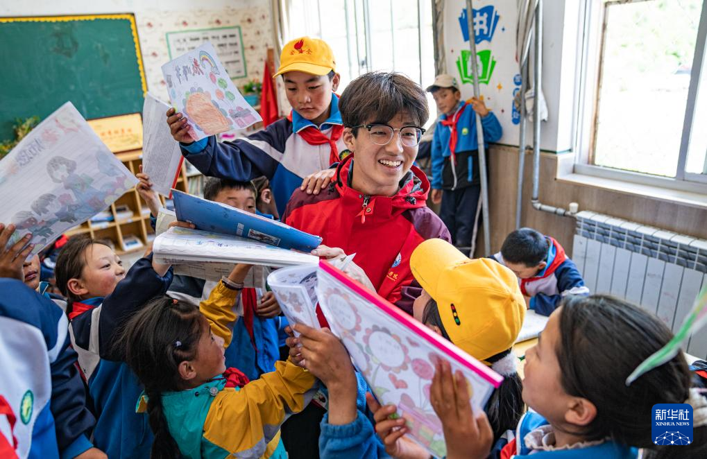 在娘蒲鄉(xiāng)中心小學(xué),孩子們把自己做好的手抄報(bào)展示給胡正培(9月3日攝)。新華社記者 丁增尼達(dá) 攝