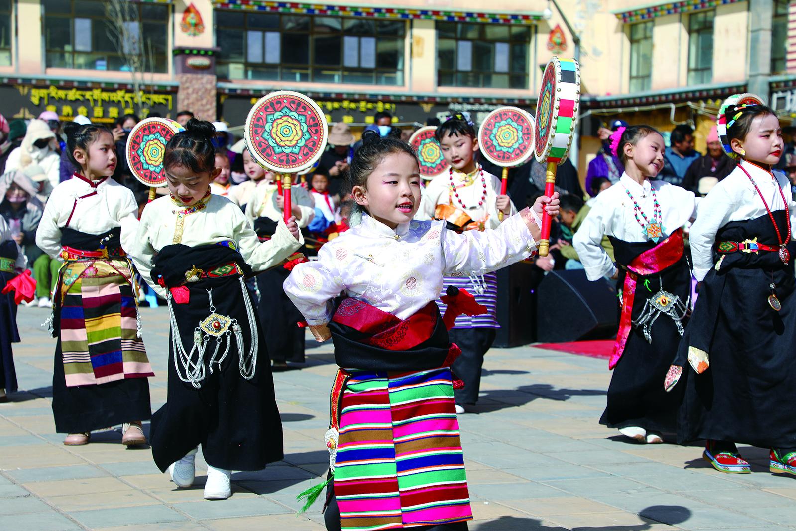 校園舞臺劇、體驗(yàn)春種秋收、收集創(chuàng)作、拼搭大型積木……通過豐富多彩的戶外活動,不僅培養(yǎng)了孩子們團(tuán)結(jié)互助的精神,也增進(jìn)了他們對中華文化的認(rèn)同。一方小舞臺,孩子們“組團(tuán)”上場,在今年8月的大班畢業(yè)典禮上,一場民族文藝舞臺劇精彩上演,“囊謙縣有豐富的文化資源,多項(xiàng)非遺保護(hù)項(xiàng)目,我們就將‘非遺’帶到孩子身邊,用靈動的文化故事滋潤他們,在劇目學(xué)習(xí)、情景再造中潛移默化培養(yǎng)團(tuán)結(jié)友愛的品質(zhì)。”舞臺劇創(chuàng)編老師代吉曲宗說。